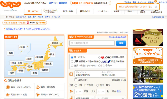 じゃらんネットは、リクルートが運営する国内最大級の宿泊予約サイトで、以前から便利そうだから利用してみたいと思っていました。